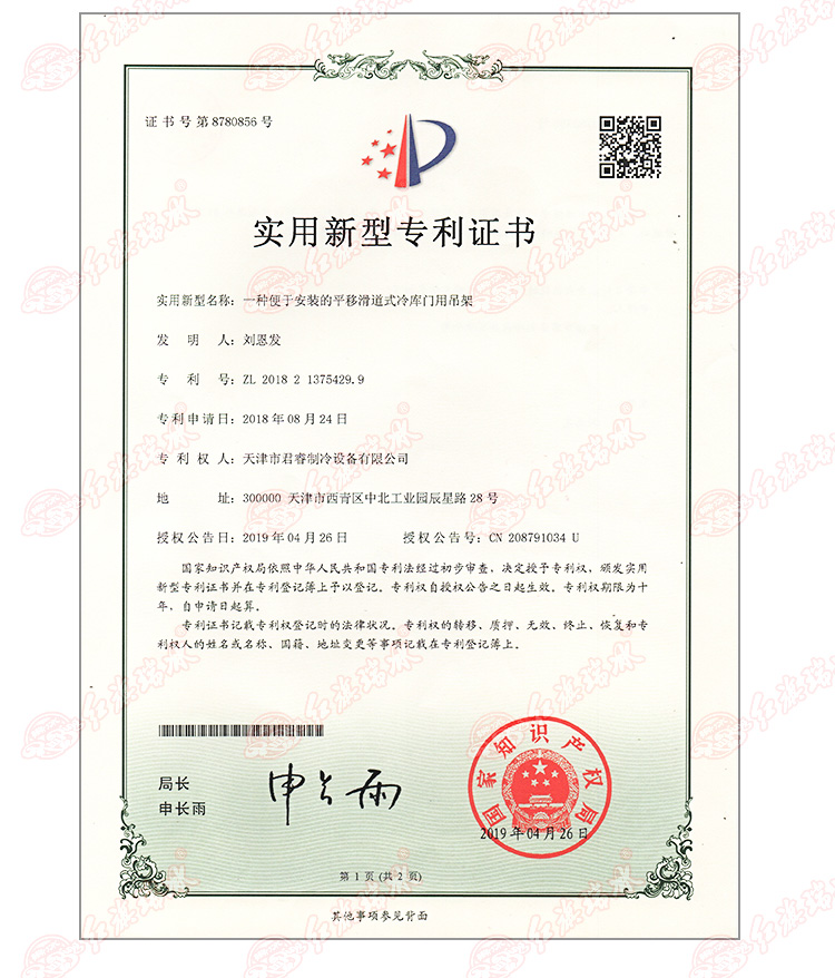 近日,天津紅旗制冷再次榮獲由中華人民共和國國家知識產(chǎn)權(quán)局頒發(fā)的兩項(xiàng)發(fā)明專利證書,分別是實(shí)用型專利證書“一種便于安裝的平移滑道式冷庫門用吊架”和外觀設(shè)計(jì)專利證書“冷庫門”,這兩項(xiàng)專利已成功運(yùn)用到紅旗冷庫門制作。
